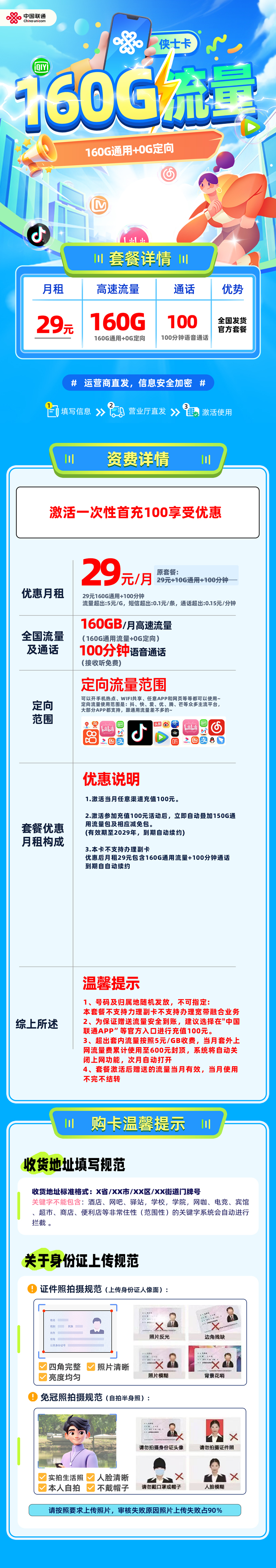 联通雷龙卡 29元包160G通用+200分钟